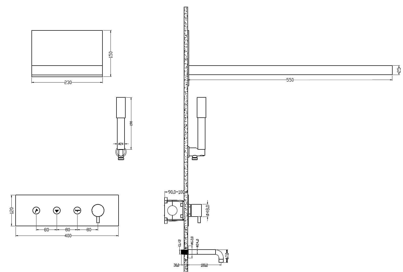 Batteria da bagno incorporata con doccetta, soffione e presa d'acqua