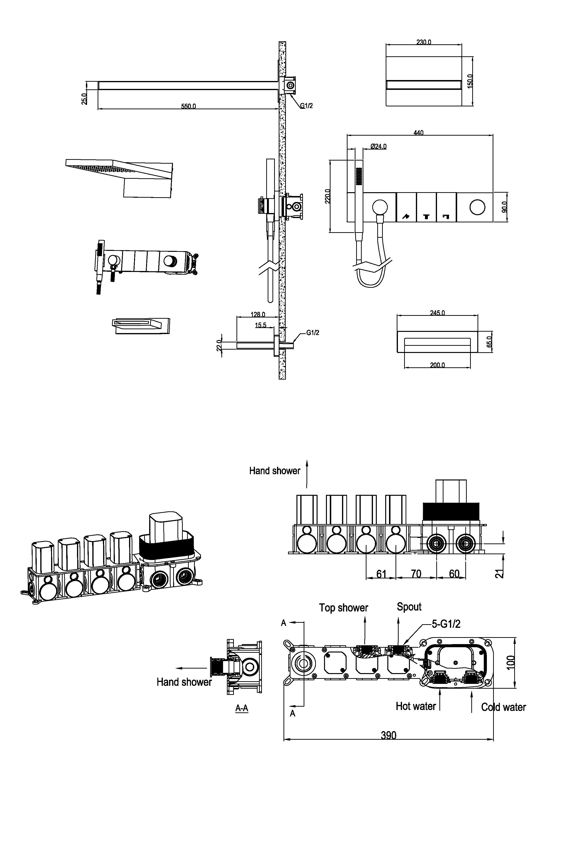 Batteria da bagno a scomparsa con termostato con doccetta, soffione e presa d'acqua