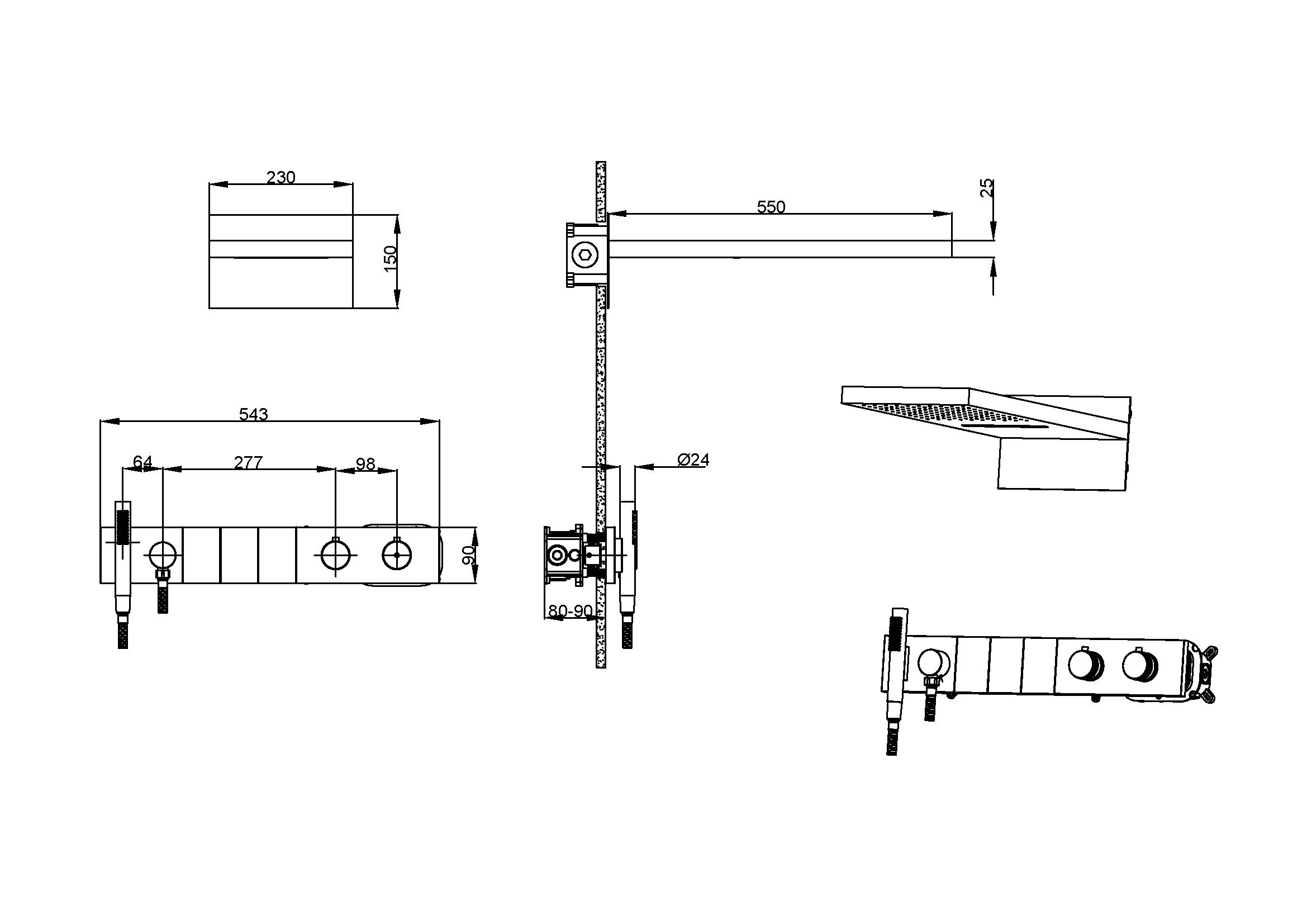 Batteria da bagno a scomparsa con termostato con doccetta, soffione e presa d'acqua